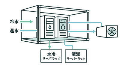 AI開発などで需要が高まるGPUサーバの収容にも対応。膨大な計算処理等で発生する高発熱に対しても、「水冷」や「液浸水冷方式」を採用した設計が可能です。