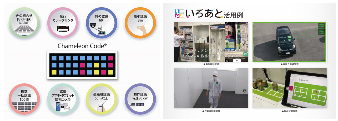 いろあととは、一度に最大100個を認識できるカラーバーコード「カメレオンコード」を活用し、製造・物流・建設業の現場業務を効率化するソリューションです。